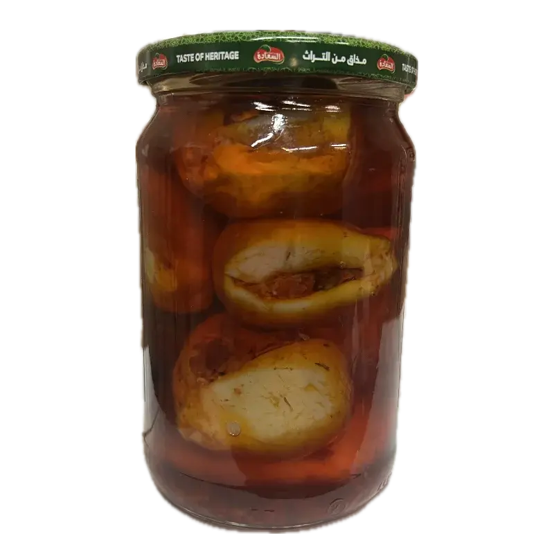 Al Saadah Makdous brings one of Syria's most beloved traditional foods to your table. This 660g jar contains perfectly prepared baby eggplants, pickled and stuffed with a rich mixture of walnuts, red peppers, garlic, and spices – all preserved in premium olive oil.