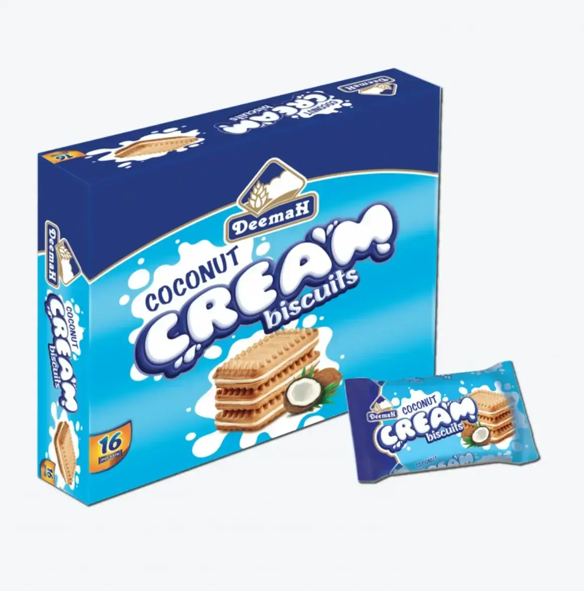 Deemah Coconut Cream Biscuits combine crispy golden cookies with a deliciously sweet coconut cream filling. A tropical twist on classic biscuits, they’re perfect with coffee, tea, or as a light dessert.