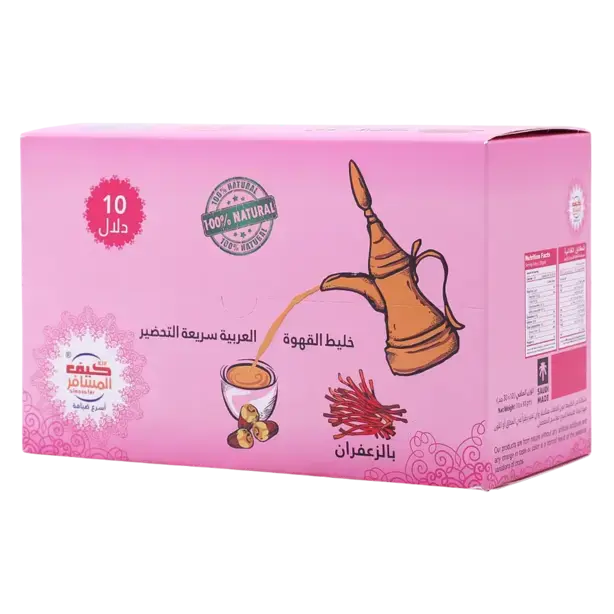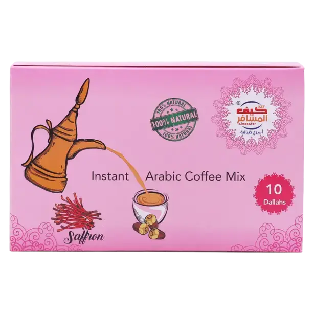 Luxury meets convenience with Kif Almosafer Instant Arabic Coffee with Saffron. This 10-sachet box (30g each) elevates instant coffee to something genuinely special by incorporating one of the world's most precious spices.