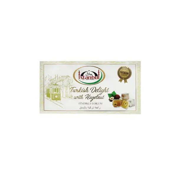 Istanbul Turkish Delight Hazelnut, Soft, chewy cubes studded with crunchy hazelnut pieces, combining nutty richness with a smooth, sweet base. A delightful treat for savouring or sharing.
